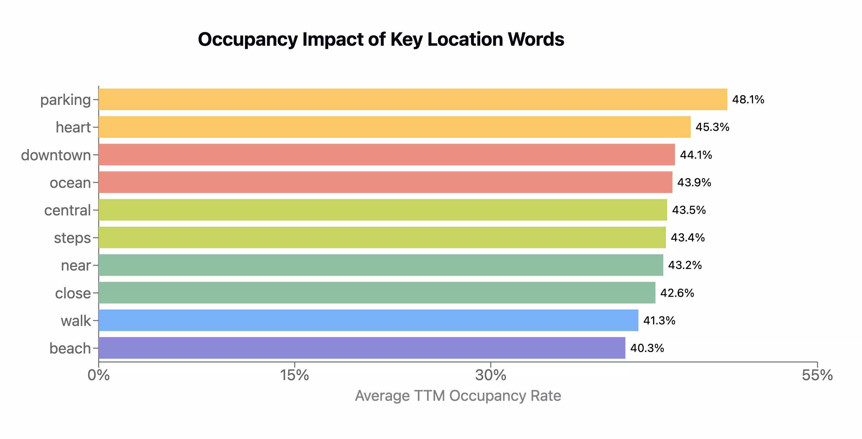 Generic words like apartment (Avg TTM Revenue: $25,415 | Avg TTM Occupancy: 48.3%) or house (Avg TTM Revenue: $37,441 | Avg TTM Occupancy: 43.2%) are functional but don't stand out. Our Airbnb data analysis shows specificity often correlates with better performance, especially revenue: