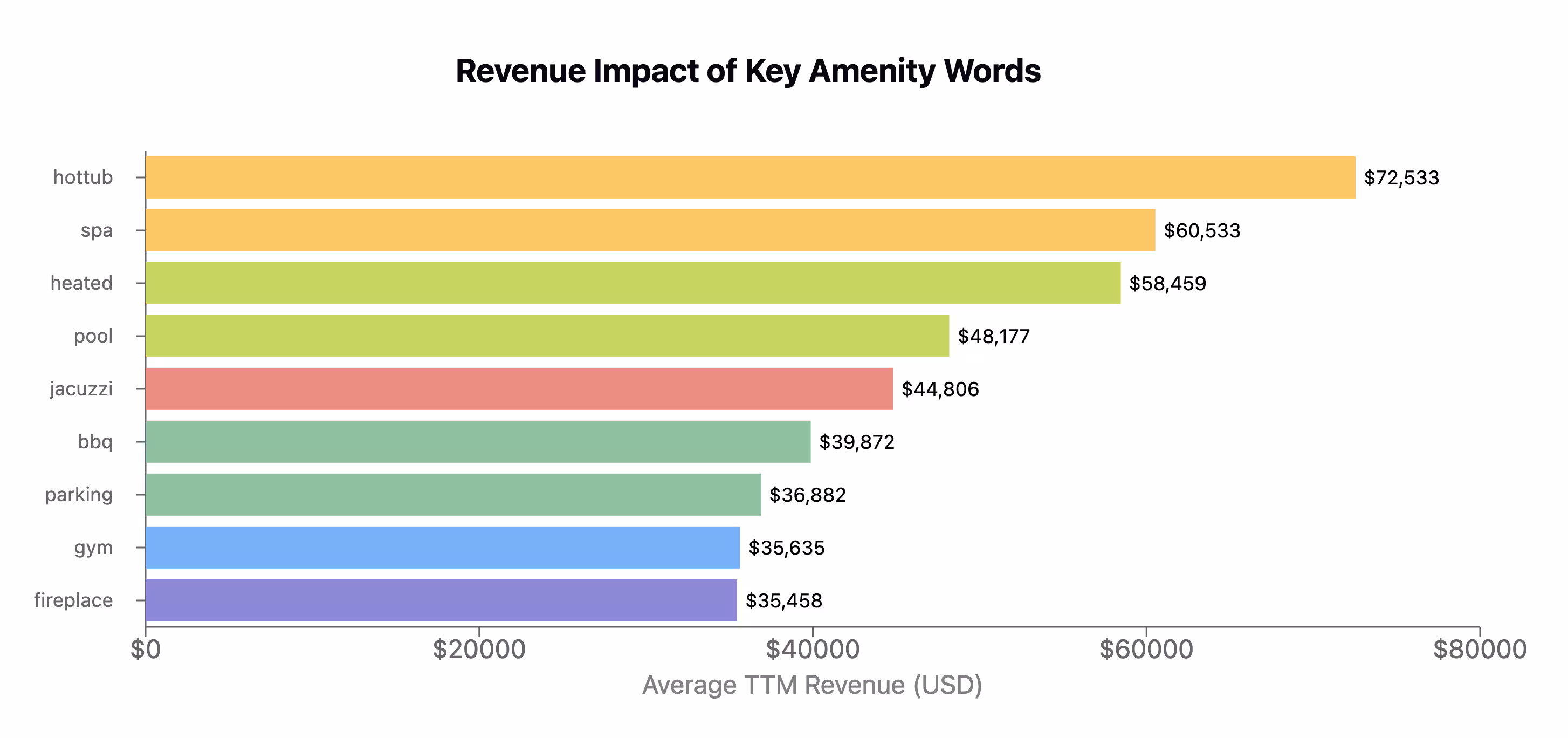 Beyond sheer scale, premium amenities are undeniable revenue drivers. Keywords like hottub ($72,533), spa ($60,533), and fire/pit (often indicating a desirable fire pit, averaging $67k-$68k) clearly attract guests willing to pay significantly more for enhanced comfort and experiences. This data highlights a key path for Airbnb revenue optimization: accurately featuring these high-impact keywords doesn't just describe; it sells a higher-value stay, directly tapping into searches for high-revenue Airbnb features. While luxury and key amenities lead, the presence of terms like fontainebleau or cart also hints that unique location branding or specific activity-related features can carve out lucrative niches.