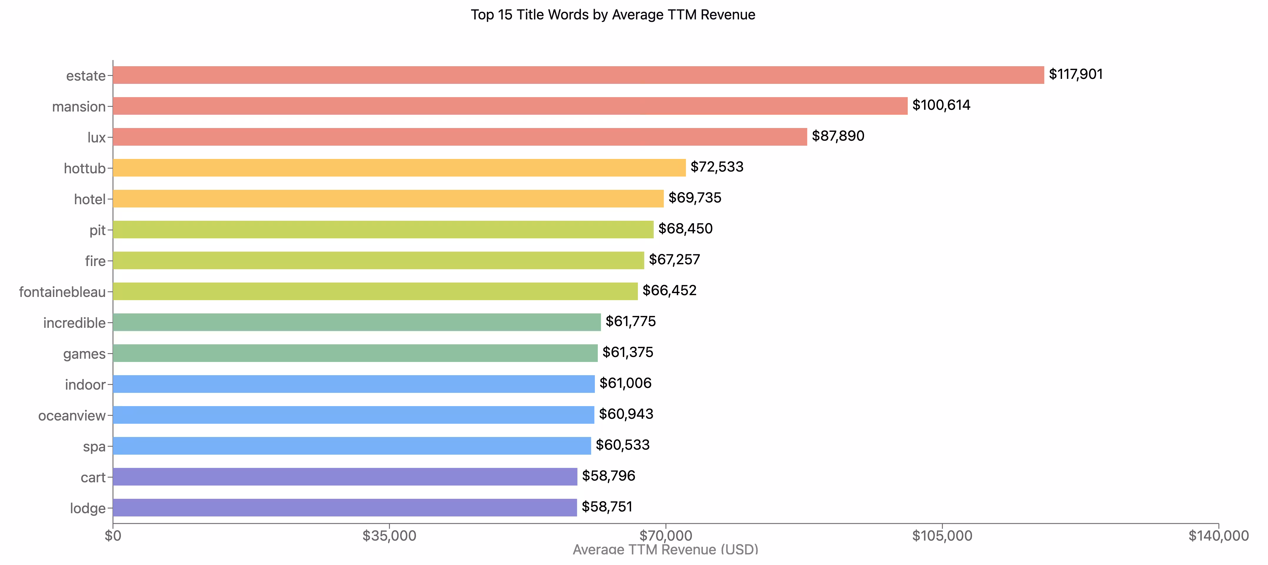 The data reveals a clear dominance of terms signaling luxury and significant space among the top Airbnb keywords by revenue: estate ($117,901), mansion ($100,614), and lux ($87,890). This strongly suggests that positioning your property towards the high-end market, if applicable, can yield substantial Airbnb revenue premiums.