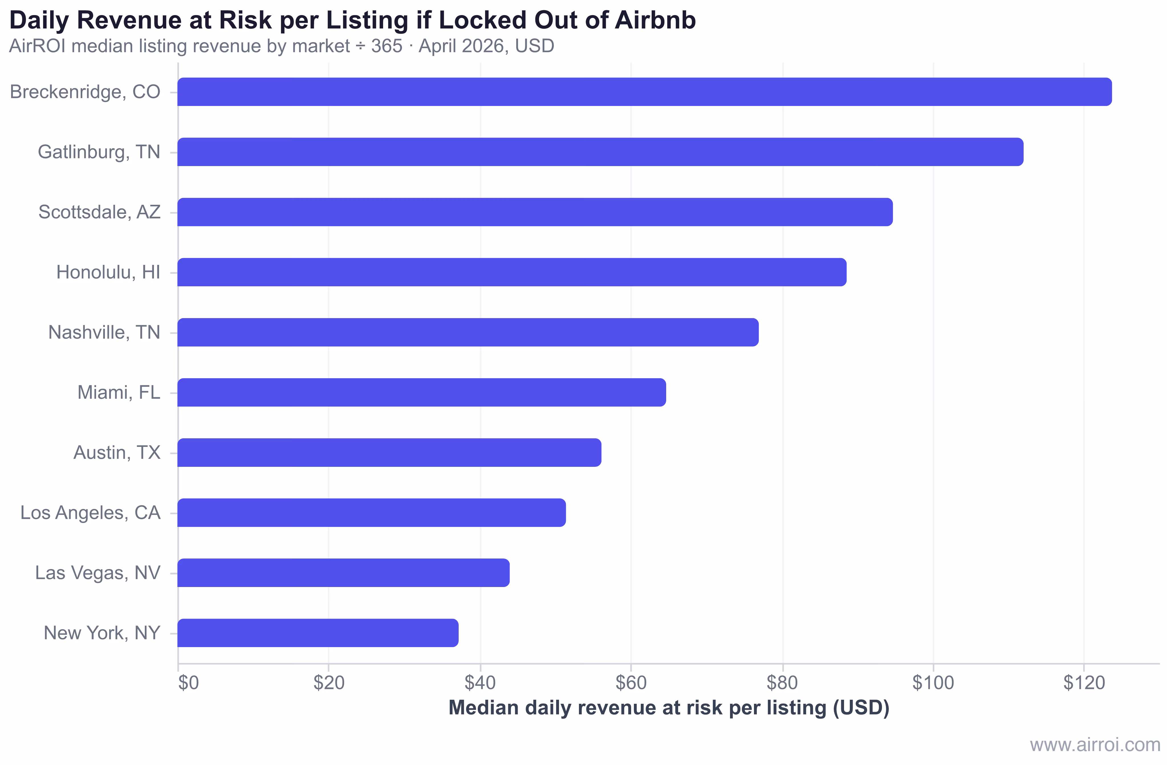 Lockout exposure depends on the market. AirROI data shows median daily revenue at risk ranges from $37.24 in New York City to $123.77 in Breckenridge, Colorado, with Gatlinburg at $112.05 and Scottsdale at $94.75. A seven-day lockout for a five-listing Gatlinburg operator represents roughly $3,922 in forgone revenue before any guest-facing cancellation damage.