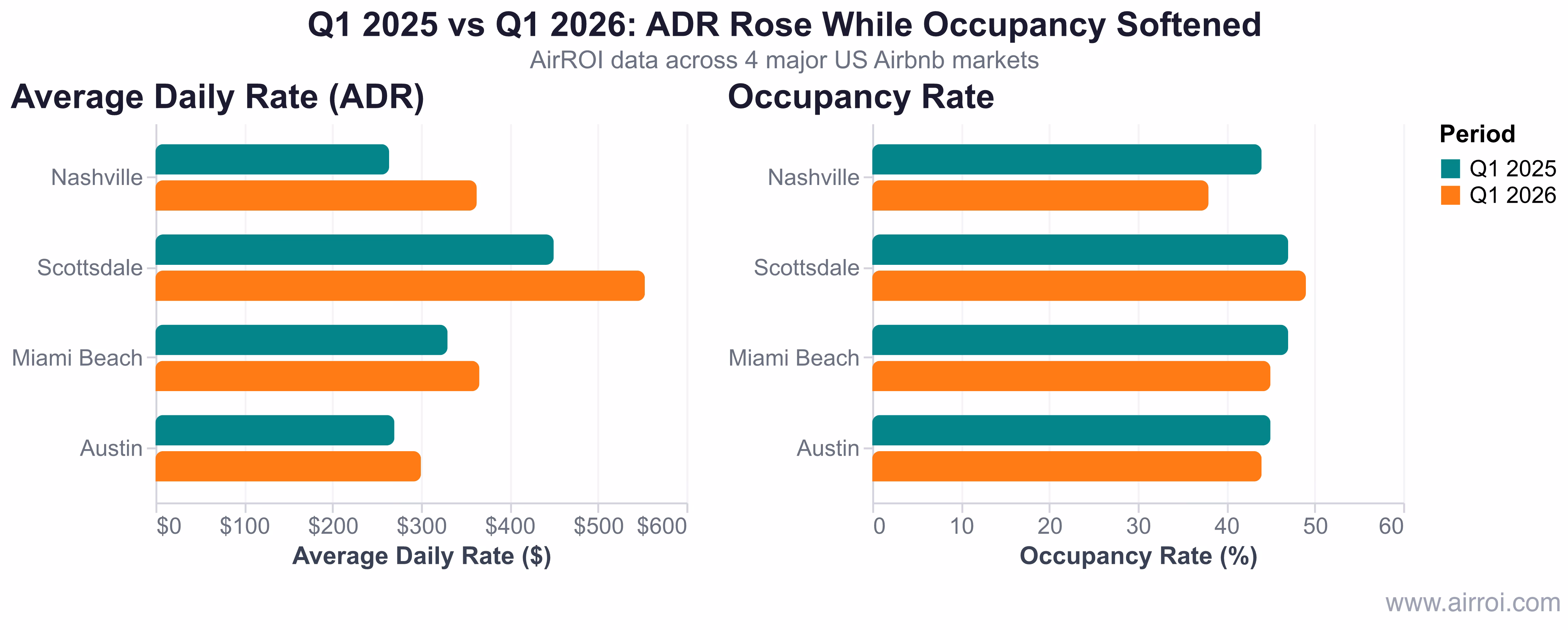 The pattern is clear: ADR is rising across every market analyzed, while occupancy is flat to declining. Nashville's 37% ADR surge alongside a 6-percentage-point occupancy drop is the most dramatic example — hosts are earning more per booked night but booking fewer nights. Scottsdale is the outlier, delivering both higher rates and slightly improved occupancy during its peak winter season.