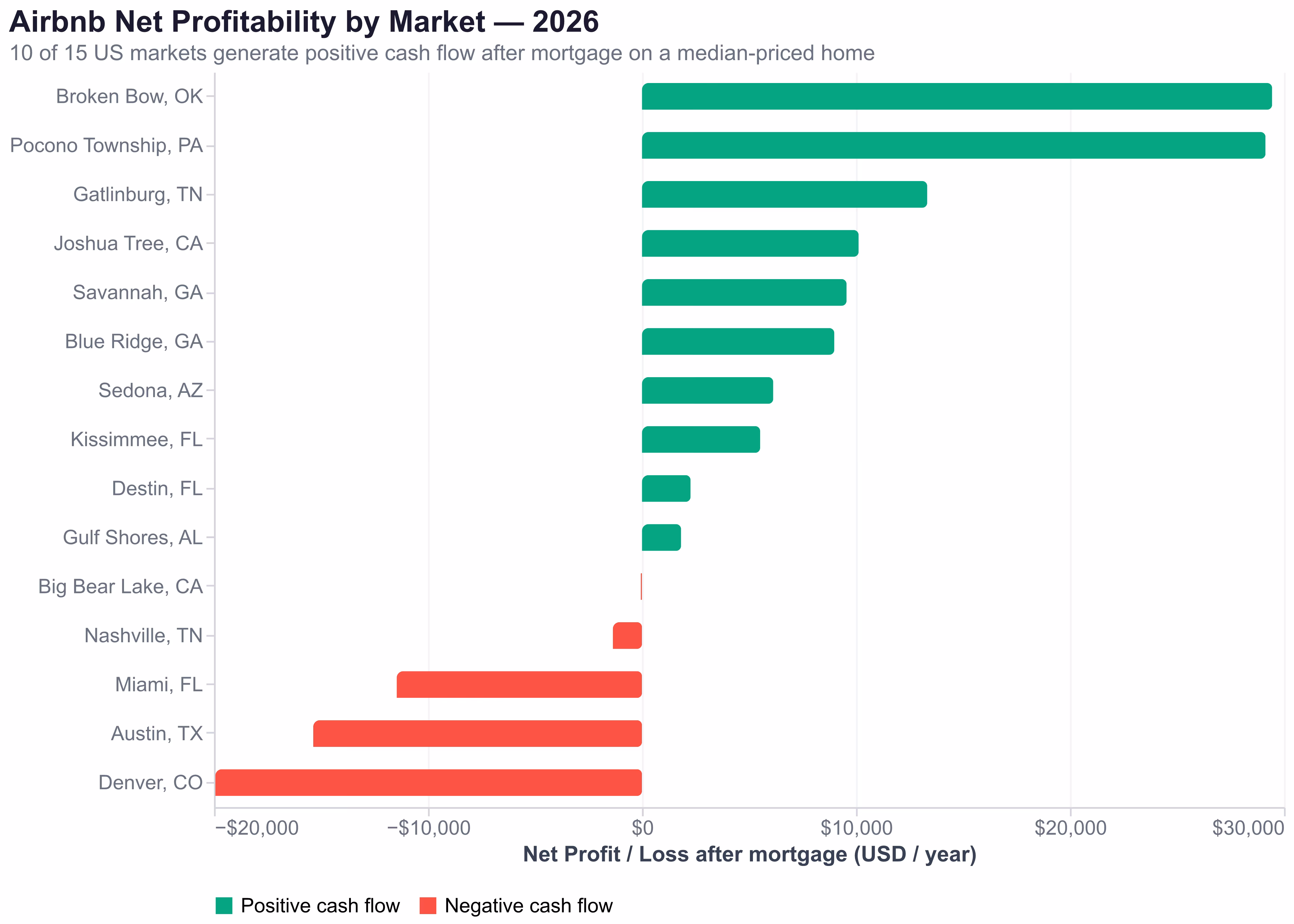 Is Airbnb profitable in 2026? Yes -- in most US markets we analyzed, when you invest outside the most expensive coastal cities. The data across 15 major US markets is now unambiguous on that point: leisure and mid-market cabin/cottage destinations deliver $9,000-$29,000 in annual net profit after all costs including mortgage on a median-priced home. Only a handful of expensive or regulated urban markets (San Francisco, Denver, Austin, Miami) still produce losses at median entry prices. And STR still beats long-term rental decisively in leisure markets, with LTR only winning in regulated coastal cities.