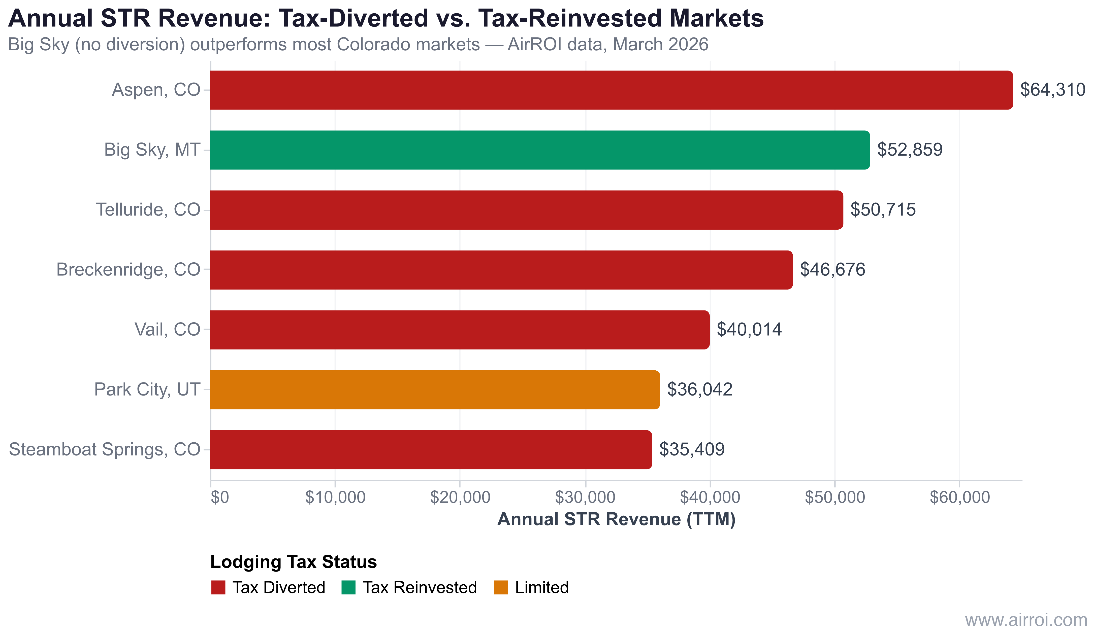 Comparison data sharpens the concern. Big Sky, Montana — a comparable mountain resort market without Colorado's tax diversion framework — generates $52,859 in median annual revenue per listing, compared to $46,676 in Breckenridge and $35,409 in Steamboat Springs. Big Sky's 36% TTM occupancy exceeds Vail (33%) and Steamboat (35%), and its $274.50 RevPAR tops every Colorado market except Aspen.
