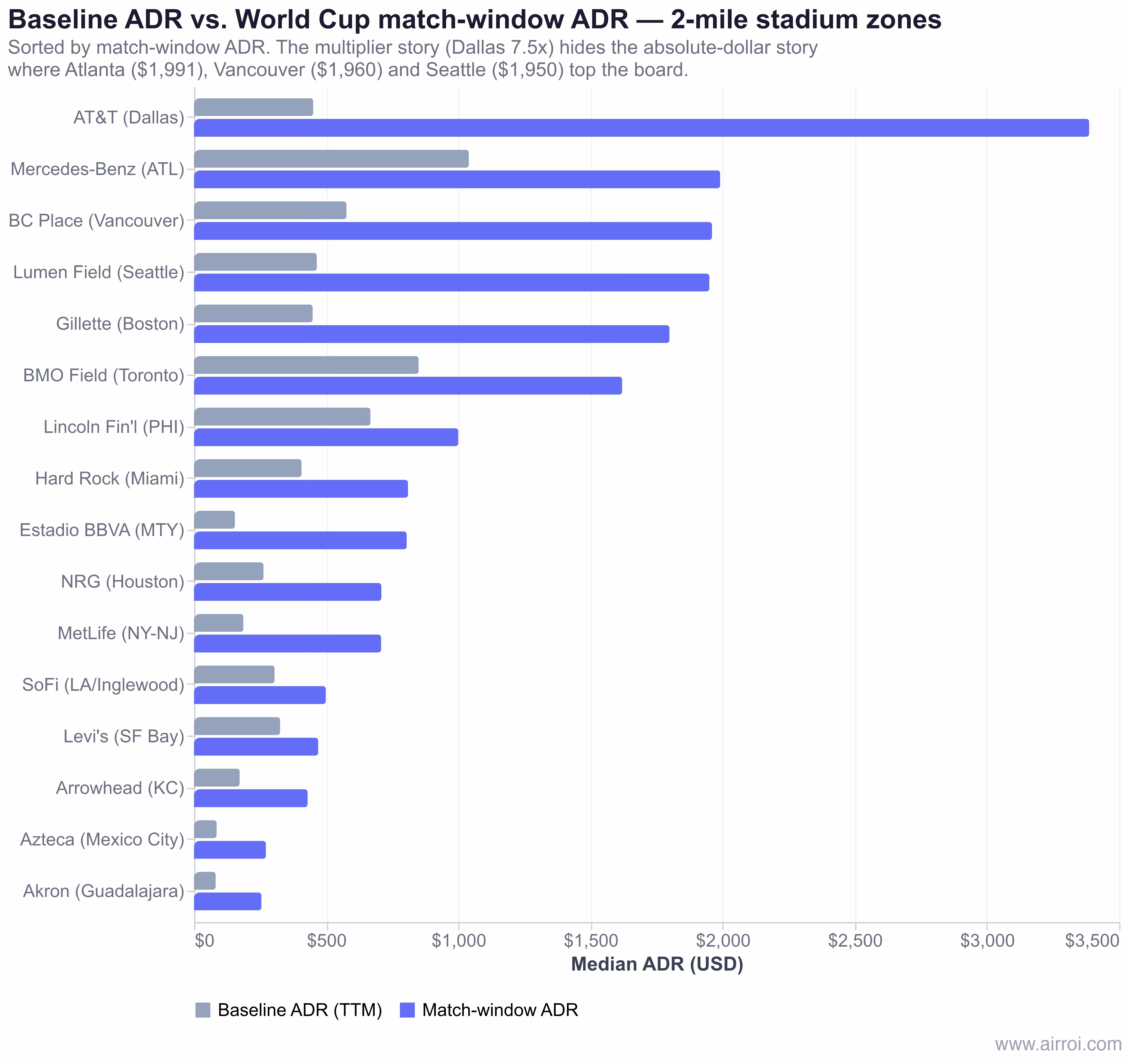 The general rule: thin supply + no nearby hotel substitutes = the tournament's highest multipliers (Arlington, Foxborough, KC). Thin supply + nearby hotel substitutes = a capped multiplier (MetLife).