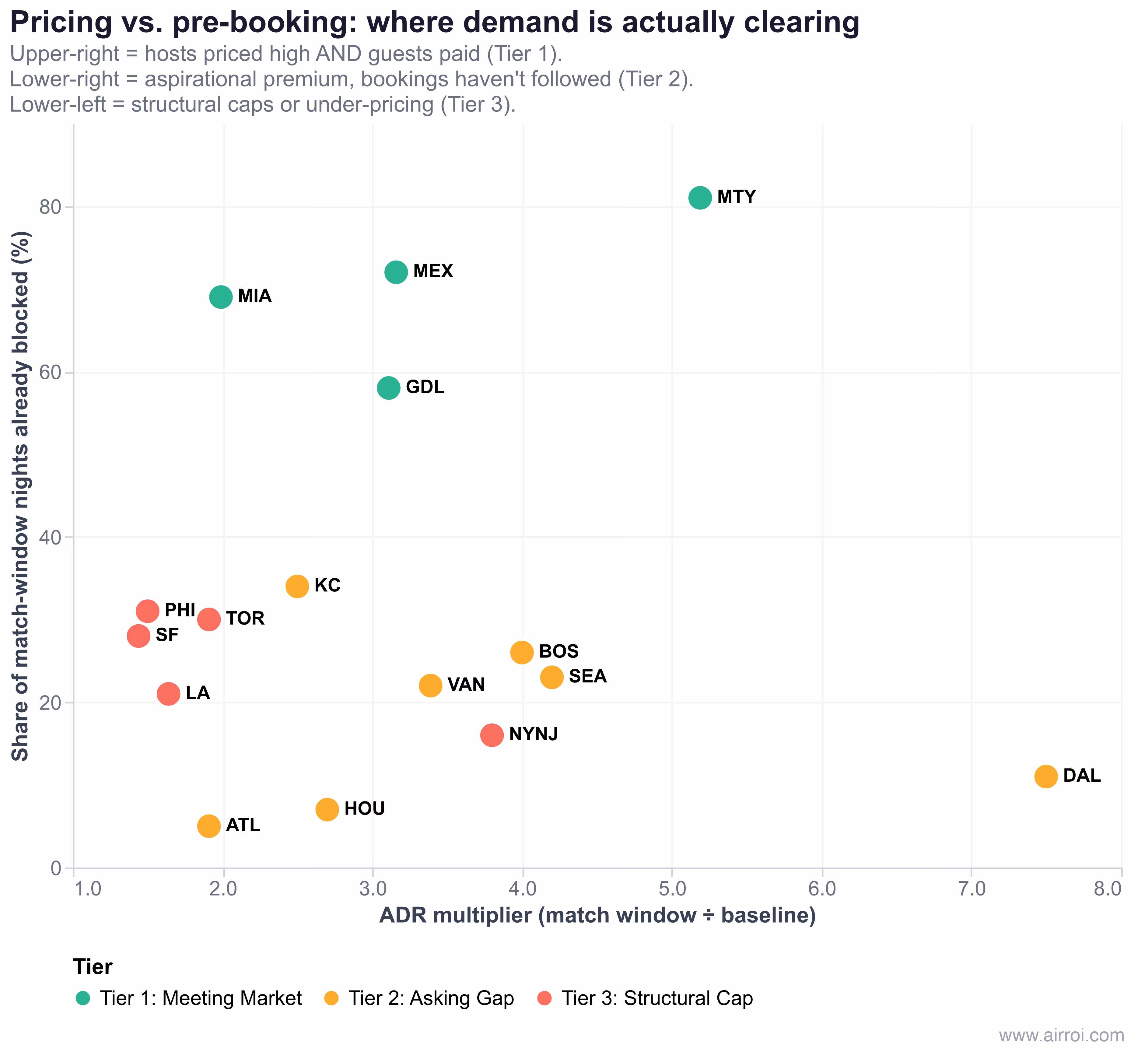 For anyone reading from the host side, the actionable question is not "what's the tournament premium?" — it's "which tier does my zone behave like?" Tier 1 hosts need modest pricing discipline. Tier 2 hosts need to watch clearing rates and adjust down if May bookings don't arrive. Tier 3 needs a diagnosis before action: Levi's and Lincoln Financial should raise prices, SoFi should ensure legal listings, MetLife should price to clear, and Toronto should recognize its absolute-dollar uplift is already substantial even at 1.91x.